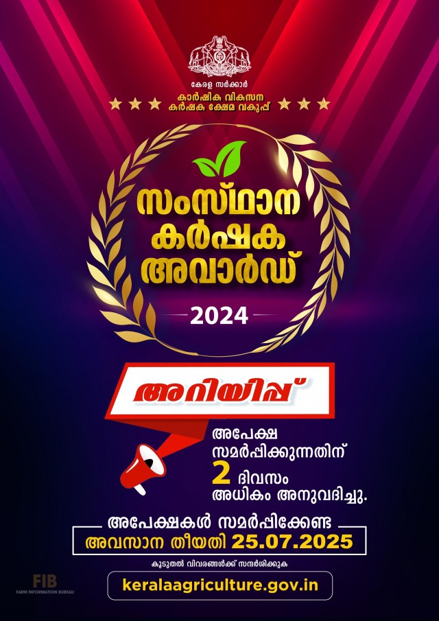 കാർഷിക വികസന കർഷക ക്ഷേമ വകുപ്പ് മുഖേന നൽകുന്ന അവാർഡുകളിലേക്ക് കർഷകർക്ക് അവരുടെ അപേക്ഷകൾ അതാത് കൃഷിഭവനുകളിൽ സമർപ്പിക്കാവുന്നതാണ്. പൂരിപ്പിച്ച അപേക്ഷ ഫോറം, അനുബന്ധ രേഖകളും നടപ്പിലാക്കിയ കാർഷിക പ്രവർത്തനങ്ങളുടെ വിശദാംശങ്ങളും സഹിതമാണ് അപേക്ഷകൾ സമർപ്പിക്കേണ്ടത്. അപേക്ഷയും കൂടുതൽ വിവരങ്ങളും കൃഷി വകുപ്പ് വെബ്സൈറ്റായ www.keralaagriculture.gov.in -ൽ പ്രസിദ്ധീകരിച്ചിട്ടുണ്ട്. അതാത് കൃഷി ഭവനുകളിൽ അപേക്ഷകൾ സമർപ്പിക്കേണ്ട പുതുക്കിയ അവസാന തീയതി 25.07.2025 ആയിരിക്കും.