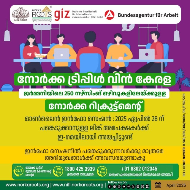 നോര്ക്ക ട്രിപ്പിള് വിൻ ഏഴാംഘട്ടത്തില് ജർമ്മനിയിലെ ഹോസ്പ്പിറ്റലുകളിലെ 250 നഴ്സിംങ് ഒഴിവുകളിലേയ്ക്കായിരുന്നു അപേക്ഷ ക്ഷണിച്ചത്. ഇതിനായി അപേക്ഷ നല്കേണ്ട അവസാന തീയതി ഏപ്രില് 14 വരെയായിരുന്നു. ഫാസ്റ്റ് ട്രാക്ക് മുഖേന മെയ് രണ്ട് വരെ അപേക്ഷ നല്കാന് അവസരമുണ്ട്. ഷോര്ട്ട്ലിസ്റ്റു ചെയ്യപ്പെടുന്നവര്ക്കായുളള അഭിമുഖം 2025 മെയ് 20 മുതല് 29 വരെ എറണാകുളത്തും തിരുവനന്തപുരത്തുമായി നടക്കും. തിരഞ്ഞെടുക്കപ്പെടുന്നവർക്ക് വിമാന ടിക്കറ്റ് ഉൾപ്പടെയുളള എല്ലാ ചെലവുകളും സൗജന്യമാണ്. നോർക്ക റൂട്ട്സും ജർമ്മൻ ഫെഡറൽ എംപ്ലോയ്മെന്റ് ഏജൻസിയും ജർമ്മൻ ഏജൻസി ഫോർ ഇന്റർനാഷണൽ കോ-ഓപ്പറേഷനും സംയുക്തമായി നടപ്പാക്കുന്ന നഴ്സിങ് റിക്രൂട്ട്മെന്റ് പദ്ധതിയാണ് ട്രിപ്പിള് വിന് കേരള. കൂടുതൽ വിവരങ്ങൾക്ക് www.norkaroots.org, www.nifl.norkaroots.org എന്നീ വെബ്സൈറ്റുകള് സന്ദര്ശിക്കുകയോ 0471 2770577, 536,540, 544 (പ്രവൃത്തി ദിവസങ്ങളില്, ഓഫീസ് സമയത്ത്) എന്നീ നമ്പറുകളിലോ 24 മണിക്കൂറും പ്രവര്ത്തിക്കുന്ന നോര്ക്ക ഗ്ലോബൽ കോണ്ടാക്ട് സെന്ററിന്റെ ടോൾ ഫ്രീ നമ്പറുകളായ 1800 425 3939 (ഇന്ത്യയില് നിന്നും) +91-8802 012 345 (വിദേശത്തുനിന്നും, മിസ്ഡ് കോള് സര്വീസ്) ബന്ധപ്പെടാവുന്നതാണ്.