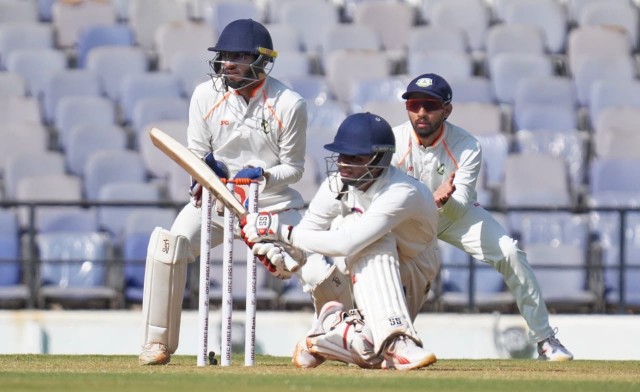 മറുപടി ബാറ്റിങ്ങിന് ഇറങ്ങിയ കേരളത്തിൻ്റെ തുടക്കം തകർച്ചയോടെയായിരുന്നു. ആദ്യ ഓവറിൽ തന്നെ റണ്ണെടുക്കാതെ രോഹൻ കുന്നുമ്മൽ പുറത്തായപ്പോൾ അക്ഷയ് ചന്ദ്രൻ 14 റൺസും നേടി മടങ്ങി. ഇരുവരെയും ദർശൻ നൽക്കണ്ടെ ക്ലീൻബൌൾഡാക്കുകായിരുന്നു. മൂന്നാം വിക്കറ്റിൽ ആദിത്യ സർവാടെയും അഹമ്മദ് ഇമ്രാനും ചേർന്നുള്ള 93 റൺസ് കൂട്ടുകെട്ടാണ് കേരളത്തെ കരകയറ്റിയത്. പരിചിതമായ സാഹചര്യങ്ങളുടെ ആനുകൂല്യം മുതലാക്കി ആത്മവിശ്വാസത്തോടെ ബാറ്റ് വീശീയ ആദിത്യ സർവാടെയുടെ പ്രകടനമാണ് ശ്രദ്ധേയമായത്. ഇടംകയ്യൻ സ്പിന്നർ ഹർഷ് ദുബൈ അടക്കമുള്ള വിദർഭ ബൌളർമാരെ സമർഥമായി നേരിട്ട സർവാടെ മനോഹരമായ ഷോട്ടുകളും പായിച്ചു. 90 പന്തുകളിൽ നിന്ന് അർദ്ധ സെഞ്ച്വറി പൂർത്തിയാക്കിയ സർവാടെ 66 റൺസുമായി ബാറ്റിങ് തുടരുകയാണ്. മറുവശത്ത് മികച്ച പിന്തുണ നല്കിയ അഹ്മദ് ഇമ്രാൻ അവസാന സെഷനിലാണ് പുറത്തായത്. അഹ്മദ് ഇമ്രാൻ 37 റൺസ് നേടി. കളി നിർത്തുമ്പോൾ ഏഴ് റൺസോടെ ക്യാപ്റ്റൻ സച്ചിൻ ബേബിയാണ് സർവാടെയ്ക്കൊപ്പം ക്രീസിൽ