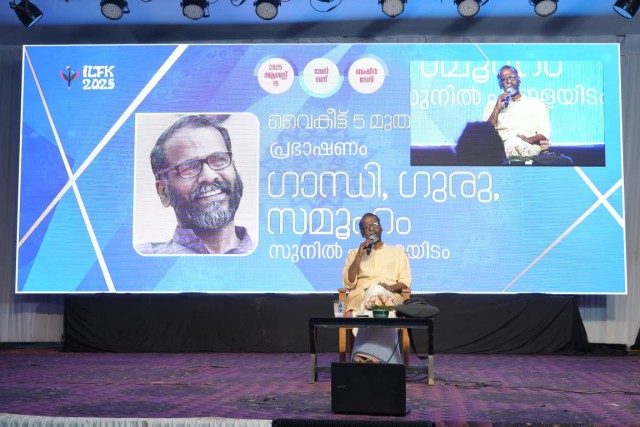 ഗാന്ധിയും ശ്രീനാരായണ ഗുരുവും തമ്മിലുള്ള കൂടിക്കാഴ്ച ദേശീയസ്വാതന്ത്ര്യത്തെവരെ സ്വാധീനിച്ച ഒന്നാണെന്ന് നിരൂപകനും പ്രഭാഷകനുമായ സുനിൽ പി. ഇളയിടം അഭിപ്രായപ്പെട്ടു. സാർവ്വദേശീയ സാഹിത്യോത്സവത്തിൽ 'ഗാന്ധി, ഗുരു, സമൂഹം' എന്ന വിഷയത്തെ അധികരിച്ച് സംസാരിക്കുകയായിരുന്നു അദ്ദേഹം. ദേശീയതവാദത്തിന്റെ ആരംഭം മുതൽ അതിന് വൈദികവും ബ്രാഹ്മണികവുമായ പരിവേഷമുണ്ടെന്നും മതപരമായ ദേശീയതയുടെ ബീജാവാപം നടന്നത് 19-ാം നൂറ്റാണ്ടിന്റെ ആദ്യ ദശകങ്ങളിൽ തന്നെയെന്നും അദ്ദേഹം കൂട്ടിച്ചേർത്തു. ഗാന്ധി ഒരു ജൈവിക തത്വജ്ഞാനിയാണെന്നും മനുഷ്യരുടെ ഭൗതികമായ പ്രശ്നങ്ങളെ അഭിസംബോധന ചെയ്ത ചിന്തകനാണെന്നും അദ്ദേഹം കൂട്ടിച്ചേർത്തു.