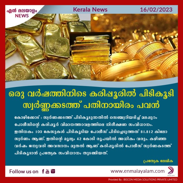 ഒരു വർഷത്തിനിടെ കരിപ്പൂരിൽ പിടികൂടി സ്വർണ്ണക്കടത്ത് പതിനായിരം പവൻ