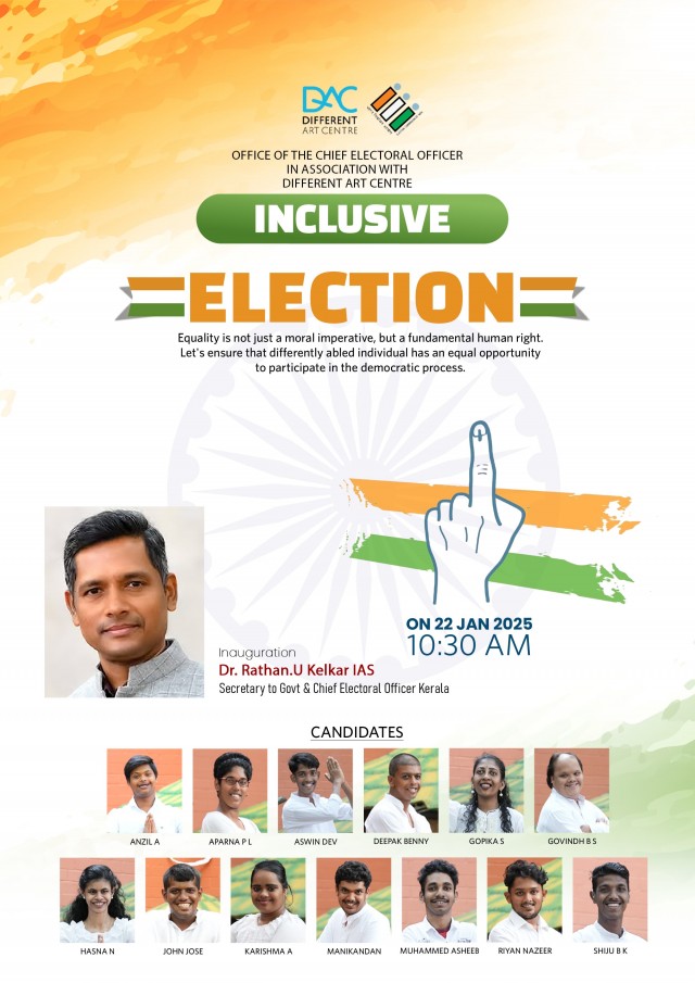 തിരഞ്ഞെടുപ്പ് പ്രക്രിയയുടെ ഉദ്ഘാടനം ചീഫ് ഇലക്ട്രല് ഓഫീസര് ഡോ.രത്തന് യു.ഖേല്ക്കര് ഐ.എ.എസ് നിര്വഹിക്കും. ഡിഫറന്റ് ആര്ട് സെന്റര് എക്സിക്യുട്ടീവ് ഡയറക്ടര് ഗോപിനാഥ് മുതുകാട് അദ്ധ്യക്ഷത വഹിക്കുന്ന ചടങ്ങില് അഡീഷണല് ചീഫ് ഇലക്ട്രല് ഓഫീസര് ഷര്മിള.സി മുഖ്യപ്രഭാഷണം നടത്തും. ഡിഫറന്റ് ആര്ട് സെന്റര് ഡയറക്ടര് ഷൈല തോമസ് സ്വാഗതവും ഇന്റര്വെന്ഷന് ഡയറക്ടര് ഡോ.അനില്കുമാര് നായര് നന്ദിയും പറയും.