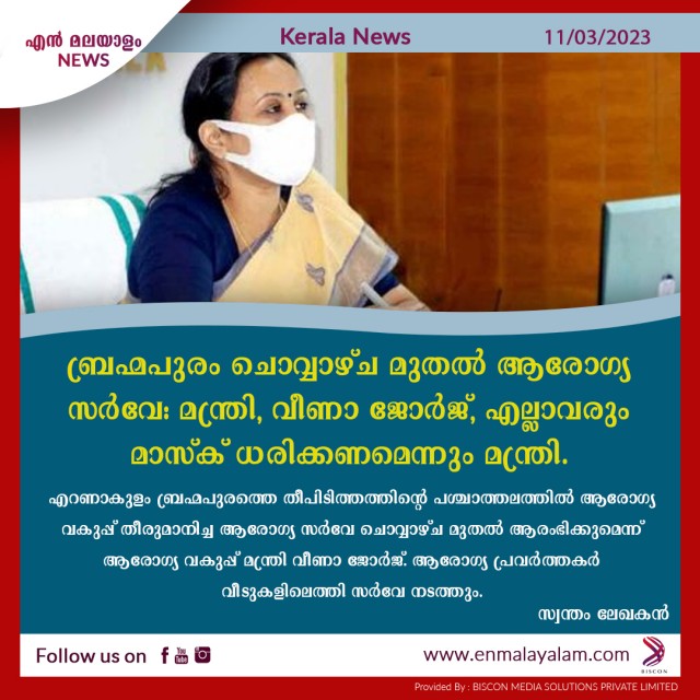 ബ്രഹ്മപുരം ചൊവ്വാഴ്ച മുതല് ആരോഗ്യ സര്വേ: മന്ത്രി, വീണാ ജോര്ജ്, എല്ലാവരും മാസ്ക് ധരിക്കണമെന്നും മന്ത്രി.