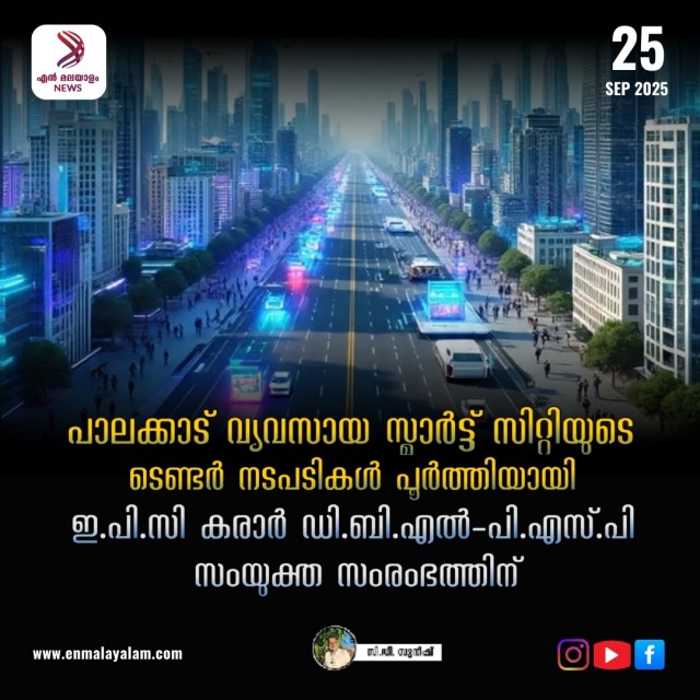 പാലക്കാട് വ്യവസായ സ്മാർട്ട് സിറ്റിയുടെ ടെണ്ടർ നടപടികൾ പൂർത്തിയായി ഇ.പി.സി കരാര് ഡി.ബി.എല്-പി.എസ്.പി സംയുക്ത സംരംഭത്തിന്