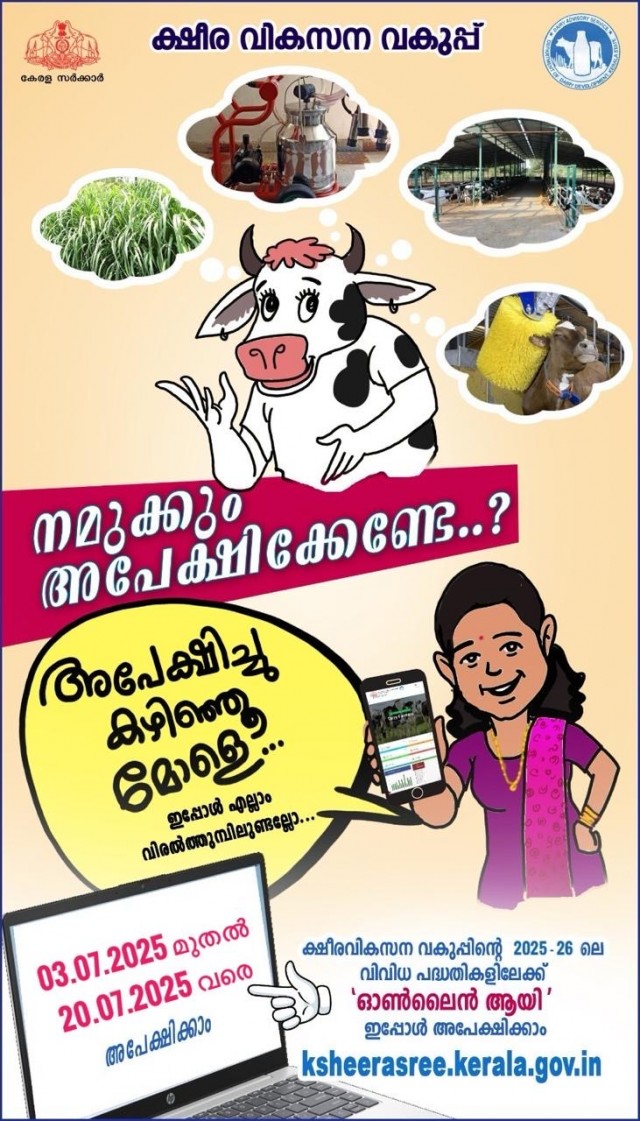 ക്ഷീര വികസന വകുപ്പിന്റെ 2025-26 സാമ്പത്തിക വർഷത്തിലെ വിവിധ പദ്ധതികൾ നടപ്പിലാക്കാൻ താൽപര്യമുള്ളവരിൽനിന്ന് ഓൺലൈൻ ആയി അപേക്ഷകൾ ക്ഷണിക്കുന്നു.