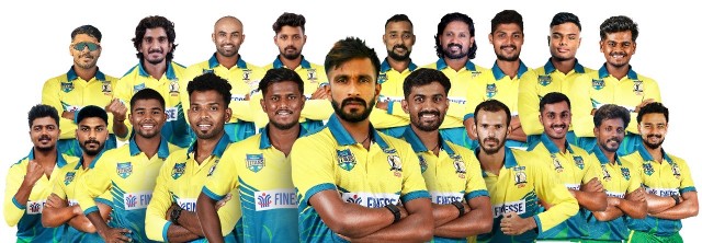 ടീം അംഗങ്ങള്: ബാറ്റര് - ആനന്ദ്കൃഷ്ണന്, അഹ്മദ് ഇമ്രാന്, ഷോണ് റോജര്, അക്ഷയ് മനോഹര്, രോഹിത് കെ ആര്, വിഷ്ണു മേനോന്, അരുണ് പൗലോസ്, അജു പൗലോസ്. ഓള് റൗണ്ടര് - വിനോദ് കുമാര് സി വി, സിജോമോന് ജോസഫ് ( ക്യാപ്റ്റന്), സിബിന് ഗിരീഷ്. ഫാസ്റ്റ് ബൗളര്മാര് - നിധീഷ് എം ഡി, ആനന്ദ് ജോസഫ്, ആതിഫ് ബിന് അഷ്റഫ്, ആദിത്യ വിനോദ്. സ്പിന്നര്മാര് - മുഹമ്മദ് ഇഷാഖ്, അജ്നാസ് കെ, അമല് രമേഷ്.