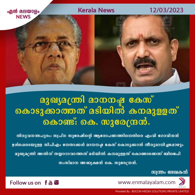 മുഖ്യമന്ത്രി മാനനഷ്ട കേസ് കൊടുക്കാത്തത് മടിയിൽ കനമുള്ളത് കൊണ്ട്: കെ. സുരേന്ദ്രൻ.