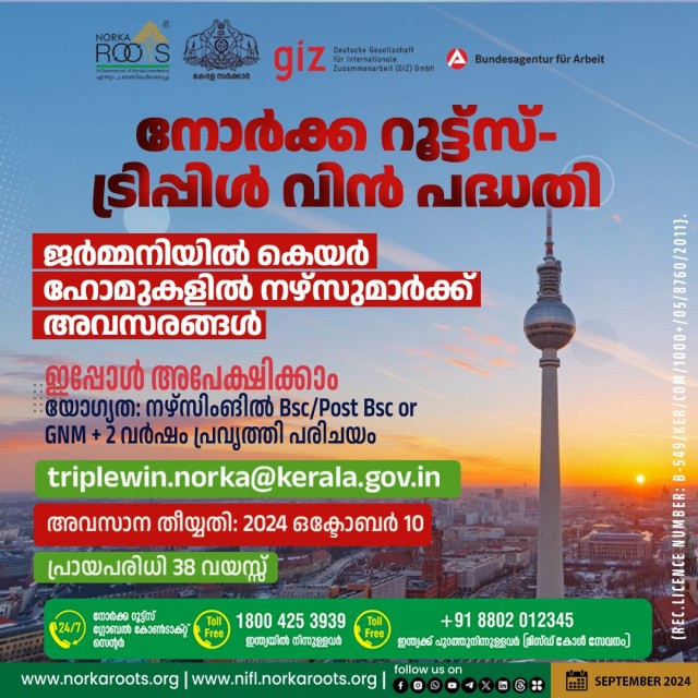 നോര്ക്ക റൂട്ട്സ്-ട്രിപ്പിള് വിന് റിക്രൂട്ട്മെന്റിലേയ്ക്ക് ഇപ്പോള് അപേക്ഷിക്കാം.