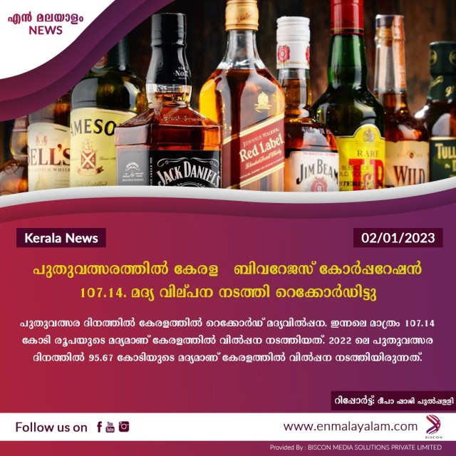 പുതുവത്സരത്തിൽ കേരള ബിവറേജസ് കോർപ്പറേഷൻ 107.14. മദ്യ വില്പന നടത്തി റെക്കോർഡിട്ടു