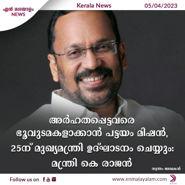 അര്ഹതപ്പെട്ടവരെ ഭൂവുടമകളാക്കാന് പട്ടയം മിഷന്, 25ന് മുഖ്യമന്ത്രി ഉദ്ഘാടനം ചെയ്യും: മന്ത്രി കെ രാജന്