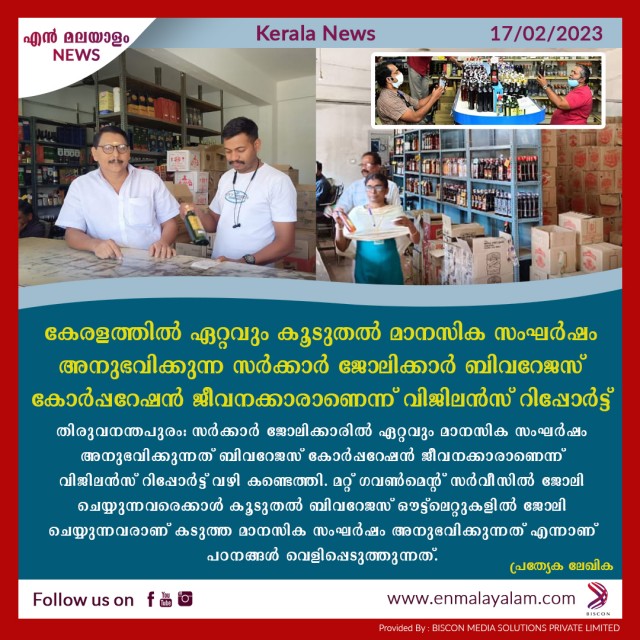 കേരളത്തിൽ ഏറ്റവും കൂടുതൽ മാനസിക സംഘർഷം അനുഭവിക്കുന്ന സർക്കാർ ജോലിക്കാർ ബിവറേജസ് കോർപ്പറേഷൻ ജീവനക്കാരാണെന്ന് വിജിലൻസ് റിപ്പോർട്ട്