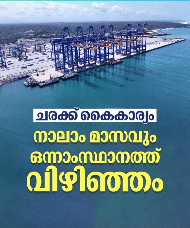 തുടർച്ചയായി നാലാം മാസവും ചരക്ക് കൈകാര്യത്തിൽ വിഴിഞ്ഞം അന്താരാഷ്ട്ര തുറമുഖം ഒന്നാംസ്ഥാനത്ത്. മെയ് മാസത്തിൽ 1.04 ലക്ഷം കണ്ടെയ്നറാണ് കൈകാര്യം ചെയ്തത്. ഏപ്രിലിൽ 1,04,413 ടിഇയു കണ്ടെയ്നർ കൈകാര്യം ചെയ്തിരുന്നു. ദക്ഷിണ, കിഴക്കൻ തുറമുഖങ്ങളിൽവച്ച് ഏറ്റവും കൂടുതൽ ചരക്ക് കൈകാര്യം ചെയ്താണ് മുന്നിലെത്തിയത്. മാർച്ചിൽ 1,08,770 ടിഇയുവും ഫെബ്രുവരിയിൽ 78,833 ടിഇയുവും എന്നനിലയിലായിരുന്നു വിഴിഞ്ഞത്തെ ചരക്ക് നീക്കം.