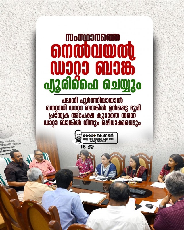 സംസ്ഥാനത്തെ നെല്വയലുകളുടെ ഡേറ്റാബാങ്ക് സംശുദ്ധീകരിച്ച് അന്തിമമാക്കാന് നടപടിയായി അതിനായി ഉന്നത തല യോഗം തദ്ദേശ സ്വയംഭരണ വകുപ്പ് മന്ത്രി എം ബി രാജേഷ്, കൃഷി വകുപ്പ് മന്ത്രി പി പ്രസാദ് എന്നിവര് പങ്കെടുത്തു കൊണ്ട് തിരുവനന്തപുരത്ത് ചേര്ന്നു. പ്രസ്സുത യോഗത്തിലാണ് സംസ്ഥാനത്തെ ഡേറ്റാബാങ്ക് സംശുദ്ധീകരിച്ച് അന്തിമമാക്കുന്നതിനുള്ള നടപടി സ്വീകരിക്കുവാന് ബന്ധപ്പെട്ടവര്ക്ക് നിര്ദ്ദേശം നല്കിയത്. 2008 ലെ ഉപഗ്രഹ ചിത്രങ്ങളുടെ സഹായത്തോടെയാണ് ഡേറ്റാബാങ്ക് പ്യൂരിഫിക്കേഷനുള്ള നടപടികള് പൂര്ത്തീകരിക്കുക. KSREC (കേരള സ്റ്റേറ്റ് റിമോട്ട് സെന്സിംഗ് & എന്വയോണ്മെന്റ് സെന്റര് ) നെയാണ് നിര്വ്വഹണ ചുമതല ഏല്പ്പിച്ചിട്ടുള്ളത്. നിലവില് തദ്ദേശസ്വയംഭരണ വകുപ്പ് നല്കിയ 500 ഡേറ്റാ ബാങ്കുകളില് നിന്നും 486 എണ്ണവും സംശുദ്ധീകരിച്ച് ബന്ധപ്പെട്ട കൃഷിഭവനുകള്ക്ക് നല്കിയിട്ടുണ്ട്. ശേഷിക്കുന്ന ഡേറ്റാ ബാങ്കുകളുെ സംശുദ്ധീകരണമാണ് 3 മാസം കൊണ്ട് പൂര്ത്തീകരിക്കാന് തീരുമാനിച്ചിട്ടുള്ളത്. ഇതിനായി കാര്ഷിക അഭിവൃദ്ധി ഫണ്ടില് നിന്നും 230.80 ലക്ഷം രൂപ അനുവദിച്ച് ഉത്തരവായിട്ടുണ്ട്. ഡേറ്റാ ബാങ്കുകളുടെ സംശുദ്ധീകരണം പൂര്ത്തിയാക്കിയായാല് തെറ്റായി ഡേറ്റാ ബാങ്കില് ഉള്പ്പെട്ട ഭൂമി ഒഴിവാക്കപ്പെടും. ഈ ഭൂമികള്ക്ക് തരം മാറ്റുന്നതിനായി ഫോം നമ്പര് 5 ല് അപേക്ഷിക്കേണ്ട സാഹചര്യം ഒഴിവാക്കപ്പെടുകയും ചെയ്യും. ഇതിലൂടെ ഭൂമി തരം മാറ്റാനായി അപേക്ഷ നല്കിയിട്ടുള്ള ആയിര കണക്കിന് ആളുകള്ക്ക് ആശ്വാസമാകുന്നത്. നെല്വയല് തണ്ണീര്ത്തട സംരക്ഷണ നിയമം നിലവില് വന്ന 2008 വര്ഷം അടിസ്ഥാനമാക്കിയാണ് ഡേറ്റാ ബാങ്ക് തയ്യാറാക്കുന്നത്. 2008 ല് നിലമായി കിടന്ന ഭൂമി അതിനു ശേഷം നികത്താന് പാടില്ല എന്നതാണ് വ്യവസ്ഥ. ആയതിനാല് 2008 ല് നിലമായി കിടന്ന ഭൂമിയുടെ പട്ടികയാണ് തദ്ദേശ സ്വയംഭരണ സ്ഥാപന അടിസ്ഥാനത്തില് തയ്യാറാക്കി ഡേറ്റാ ബാങ്കായി വിജ്ഞാപനം ചെയ്യുന്നത്. 2008 ല് തിടുക്കപ്പെട്ട് തയ്യാറാക്കിയത് മൂലം ധാരാളം അപാകതകള് കടന്നു കൂടിയിട്ടുണ്ട്. ഇത് പരിഹരിക്കുന്നതിനായാണ് സാങ്കേതിക വിദ്യയുടെയും സാറ്റലൈറ്റ് ഇമേജിന്റേയും സഹായത്തോടെ ഡാറ്റാ ബാങ്കുകള് സംശുദ്ധീകരിക്കുന്നത്. ഡാറ്റാ ബാങ്കുകള് അന്തിമമാകുന്നതോടു കൂടി സംസ്ഥാനത്ത് അനധികൃത നെല്വയല് നികത്തലിന് ശാശ്വത പരിഹാരമാകും. അതേ സമയം തെറ്റായി ഡാറ്റാ ബാങ്കില് ഉള്പ്പെട്ട ഭൂമി പ്രത്യേക അപേക്ഷ കൂടാതെ തന്നെ ഡാറ്റാ ബാങ്കില് നിന്നും ഒഴിവാക്കപ്പെടും.