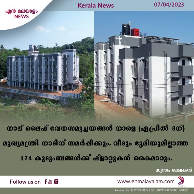നാല് ലൈഫ് ഭവനസമുച്ചയങ്ങള് നാളെ (ഏപ്രിൽ 8ന്) മുഖ്യമന്ത്രി നാടിന് സമർപ്പിക്കും വീടും ഭൂമിയുമില്ലാത്ത 174 കുടുംബങ്ങള്ക്ക് ഫ്ലാറ്റുകള് കൈമാറും.