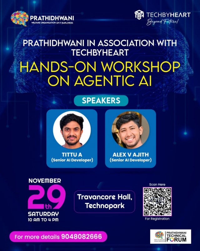 തിരുവനന്തപുരം: സംസ്ഥാനത്തെ ഐടി പാര്ക്കുകളിലെ ജീവനക്കാരുടെ ക്ഷേമ-സാംസ്കാരിക സംഘടനയായ പ്രതിധ്വനിയും കരിയര് അധിഷ്ഠിത പരിശീലന സ്ഥാപനമായ ടെക്ബൈഹാര്ട്ടും സംയുക്തമായി ഏജന്റിക് എഐ' വിഷയത്തില് ഏകദിന ശില്പശാല സംഘടിപ്പിക്കുന്നു. നവംബര് 29 ന് (ശനി) രാവിലെ 10 മുതല് വൈകുന്നേരം 4 വരെ ടെക്നോപാര്ക്കിലെ ട്രാവന്കൂര് ഹാളില് നടക്കുന്ന സൗജന്യ ശില്പശാലയില് ടെക്നോപാര്ക്കിലെ പ്രൊഫഷണലുകള്ക്ക് പങ്കെടുക്കാം.