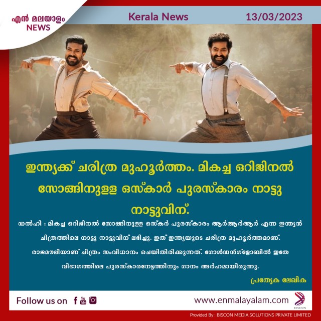 ഇന്ത്യക്ക് ചരിത്ര മുഹൂർത്തം. മികച്ച ഒറിജിനൽ സോങ്ങിനുള്ള ഒസ്കാർ പുരസ്കാരം നാട്ടു നാട്ടുവിന്.