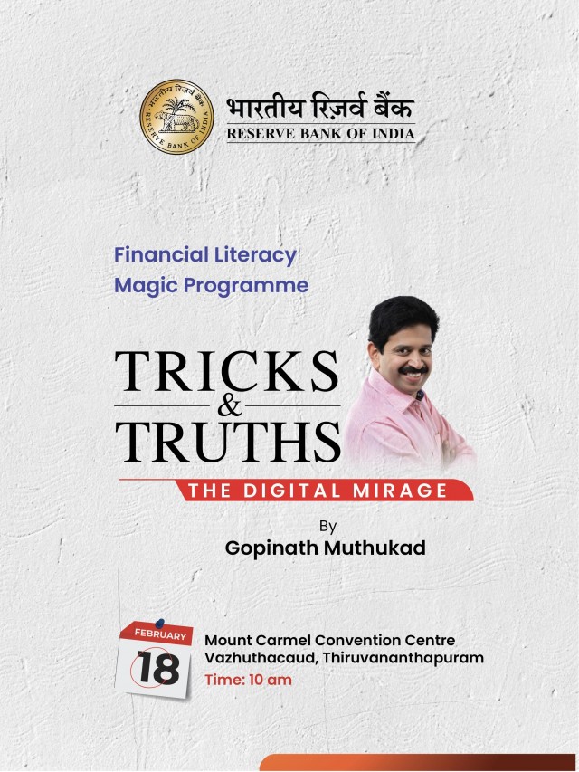 തിരുവനന്തപുരം: പൊതുജനങ്ങളില് സാമ്പത്തിക സാക്ഷരത ഉറപ്പുവരുത്തുവാന് റിസര്വ് ബാങ്ക് ഓഫ് ഇന്ത്യ നടത്തുന്ന ബോധവത്കരണ പരിപാടിയുടെ ഭാഗമായി മുതുകാടിന്റെ സോദ്ദേശ ജാലവിദ്യ ട്രിക്സ് ആന്റ് ട്രൂത്ത് ഇന്ന് (ചൊവ്വ) രാവിലെ 10ന് നടക്കും. ആര്.ബി.ഐയുടെ ഫിനാന്ഷ്യല് ഇന്ക്ലൂഷന് ആന്റ് ഡെവലപ്മെന്റ് ഡിപ്പാര്ട്ട്മെന്റിന്റെ ആഭിമുഖ്യത്തിലാണ് പരിപാടി നടക്കുന്നത്. അഭ്യസ്ത വിദ്യരടക്കം സാമ്പത്തിക തട്ടിപ്പുകളില് ഇരകളാവുന്ന ഇക്കാലത്ത് സ്വന്തം സമ്പത്ത് കരുതലോടെ കാത്തുസൂക്ഷിക്കുവാനും ചതിക്കുഴികളില് വീണുപോകാതിരിക്കുവാനും ഓര്മപ്പെടുത്തുകയാണ് മുതുകാടിന്റെ ഇന്ദ്രജാലത്തിലൂടെ.