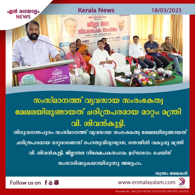 തിരുവനന്തപുരം: സംസ്ഥാനത്ത് വ്യവസായ സംരംഭകത്വ മേഖലയിലുണ്ടായത് ചരിത്രപരമായ മാറ്റമാണെന്ന് പൊതുവിദ്യാഭ്യാസ, തൊഴിൽ വകുപ്പു മന്ത്രി വി. ശിവൻകുട്ടി. ജില്ലാതല നിക്ഷേപകസംഗമം ഉദ്ഘാടനം ചെയ്ത് സംസാരിക്കുകയായിരുന്നു അദ്ദേഹം. ഏറ്റവും മികച്ച വ്യവസായ അന്തരീക്ഷമുള്ള സംസ്ഥാനങ്ങളിൽ ഒന്നാണ് കേരളം. തൊഴിലാളി - തൊഴിലുടമ ബന്ധം ഏറ്റവും ആരോഗ്യകരമായ നിലയിലാണ് ഇപ്പോഴുള്ളത്. സംസ്ഥാനത്ത് എടുത്തു പറയത്തക്ക തൊഴിൽ പ്രശ്നങ്ങളില്ല. ചെറിയ പ്രശ്നങ്ങൾ ഉയർന്നു വന്നാൽ തന്നെ അപ്പപ്പോൾ അതിൽ ഇടപ്പെട്ട് രമ്യമായ പരിഹാരം ഉണ്ടാക്കാൻ തൊഴിൽ വകുപ്പ് ഉദ്യോഗസ്ഥർ പ്രത്യേകം ശ്രദ്ധിക്കുന്നുണ്ടെന്നും മന്ത്രി പറഞ്ഞു. വ്യവസായ നിക്ഷേപം പ്രോത്സാഹിപ്പിക്കുന്നതിന്റെ ഭാഗമായി കൊണ്ടുവന്ന ഒരു ലക്ഷം സംരംഭങ്ങൾ പദ്ധതി വഴി ഒരു ലക്ഷത്തി മുപ്പത്തി അയ്യായിരത്തിൽപരം സംരംഭങ്ങൾ ഇതിനോടകം ആരംഭിച്ചു കഴിഞ്ഞു. ഇതിൽ പതിനാലായിരം (14,000) സംരംഭങ്ങൾ തലസ്ഥാന ജില്ലയായ തിരുവനന്തപുരത്ത് നിന്നാണ് എന്നത് ഏറെ അഭിമാനകരമാണ്. ജില്ലകളിൽ ഒന്നാമത് തിരുവനന്തപുരമാണെന്നും മന്ത്രി കൂട്ടിച്ചേർത്തു. പാണക്കാട് ഹാളിൽ നടന്ന ചടങ്ങിൽ വി.കെ പ്രശാന്ത് എം.എൽ.എ അധ്യക്ഷനായി. ജില്ലാ വ്യവസായ കേന്ദ്രം ജനറൽ മാനേജർ അജിത് എസ് സ്വാഗതം പറഞ്ഞു.