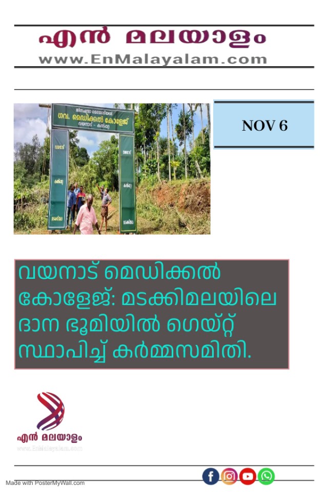 വയനാട് മെഡിക്കൽ കോളേജ് മടക്കി മല കർമ്മസമിതി അഞ്ചാം ഘട്ട സമരം തുടങ്ങി.ദാന ഭൂമി സംബന്ധിച്ച കുപ്രചരണങ്ങൾക്ക് തടയിടാൻ പൊതുജനങ്ങൾക്ക് ഭൂമിയിലേക്ക് സന്ദർശന സൗകര്യമൊരുക്കുന്നതിനുള്ള നടപടിയും തുടങ്ങി