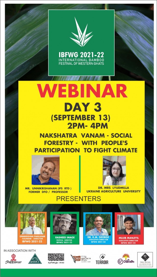 മുളകളുടെ പുനരുദ്ധാരണത്തിന് വേണ്ട കാര്യങ്ങളെ സംബന്ധിച്ച് നടത്തിയ വെബിനാറിന് ഫെസ്റ്റിവൽ ഡയറക്ടർ: റഷീദ് ഇമേജ് ബത്തേരി, Mr. ഉണ്ണികൃഷ്ണൻ (IFS RTD/ Former DFO Professor), Dr. Mrs.ലിയോട്മില്ല (Ukraine Agriculture University ) , Mr. മുജീബ് മഞ്ഞിയിൽ, Mr. ഉണ്ണികൃഷ്ണൻ പക്കനാർ (IBFWG - Founder & Director ), ഡോ.ടി. എ വർക്കി, ഡോ. എ. സി പീറ്റർ, ഡോ. അന്ന ജോസഫ്, റവ. സാജു മത്തായി കീപ്പനാശേരി എന്നിവർ നേതൃത്വം നൽകി.