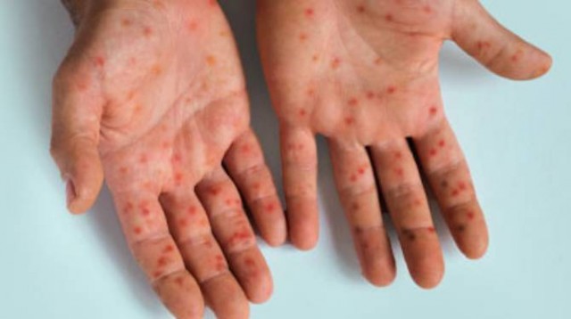 പനി തുടങ്ങി ഒരാഴ്ചയ്ക്കുള്ളിൽ ദേഹത്ത് കുമിളകളും ചുവന്ന പാടുകളും പ്രത്യക്ഷപ്പെടാൻ തുടങ്ങും. മുഖത്തും കൈകാലുകളിലുമാണ് കൂടുതൽ കുമിളകൾ കാണപ്പെടുന്നത്. ഇതിന് പുറമെ കൈപ്പത്തി, ജനനേന്ദ്രിയം, കണ്ണുകൾ എന്നീ ശരീരഭാഗങ്ങളിലും ഇവ കാണപ്പെടും.