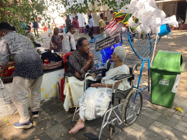 ചക്രകസേരയിലിരുത്തി പ്രയാണം നടത്തി അമ്മക്ക് സാന്ത്വനമേകുന്ന മകൻ.