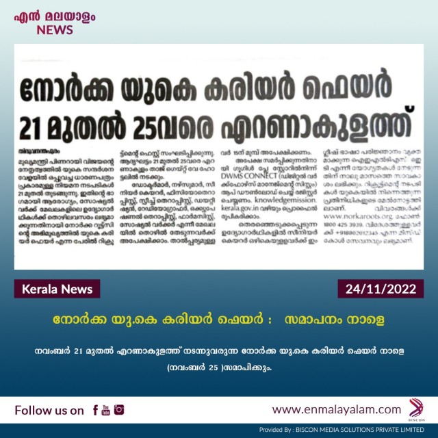 എറണാകുളം താജ് ഗേറ്റ് വേ ഹോട്ടലില് നടക്കുന്ന യുകെ കരിയർ ഫെയര് നവംബര് 21 ന് നോര്ക്ക റൂട്ട്സ് റസിഡന്റ് വൈസ് ചെയര്മാന് പി. ശ്രീരാമകൃഷ്ണനാണ് ഉദ്ഘാടനം ചെയ്തത്. മുഖ്യമന്ത്രി പിണറായി വിജയന്റെ നേതൃത്വത്തിലുളള കേരള സംഘത്തിന്റെ ലണ്ടന് സന്ദര്ശനത്തിന്റെ ഭാഗമായി കഴിഞ്ഞ മാസം ലണ്ടനിലാണ് നോര്ക്ക റൂട്ട്സ് റിക്രൂട്ട്മെന്റ് കരാര് ഒപ്പുവച്ചത്.