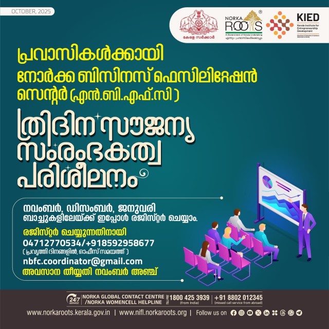 നോർക്ക ബിസിനസ് ഫെസിലിറ്റേഷൻ സെന്ററിന്റെ (എന്.ബി.എഫ്.സി) ആഭിമുഖ്യത്തിൽ പ്രവാസികൾക്കും തിരിച്ചെത്തിയ പ്രവാസികൾക്കുമായി എല്ലാ മാസവും സംഘടിപ്പിച്ചു വരുന്ന ത്രിദിന സൗജന്യ സംരംഭകത്വ പരിശീലന പരിപാടിയുടെ (റെസിഡൻഷ്യൽ) 2025 നവംബർ, ഡിസംബര്, ജനുവരി ബാച്ചുകളിലേയ്ക്ക് ഇപ്പോള് രജിസ്റ്റര് ചെയ്യാം. എറണാകുളം കളമശ്ശേരിയിൽ പ്രവര്ത്തിക്കുന്ന വ്യവസായ വാണിജ്യ വകുപ്പിന്റെ കീഴിലുളള കേരള ഇൻസ്റ്റിറ്റ്യൂട്ട് ഫോർ എന്റർപ്രണർഷിപ്പ് ഡെവലപ്പ്മെന്റ് (KIED) ക്യാമ്പസിലാണ് പരിശീലനം. പേര് രജിസ്റ്റർ ചെയ്യുന്നതിനായി 0471-2770534/+91-8592958677 (പ്രവൃത്തി ദിനങ്ങളില്, ഓഫീസ് സമയത്ത്) എന്നീ നമ്പറുകളിലോ nbfc.coordinator@gmail.com എന്ന ഇ-മെയില് വിലാസത്തിലോ നവംബര് അഞ്ചിനകം ബന്ധപ്പെടേണ്ടതാണ്. സംരംഭങ്ങൾ ആരംഭിക്കാൻ നടപടികൾ സ്വീകരിച്ചവരെയും, നിലവില് സംരംഭങ്ങൾ ആരംഭിച്ചവർക്കുമാണ് പ്രവേശനം ലഭിക്കുക. പ്രവാസികള്ക്കായി എല്ലാ മാസവും മൂന്നാമത്തെ ആഴ്ചയിലാണ് പരിശീലനം സംഘടിപ്പിക്കുന്നത്. ഒരു ബാച്ചിൽ പരമാവധി 30 പേർക്കാണ് പ്രവേശനം.