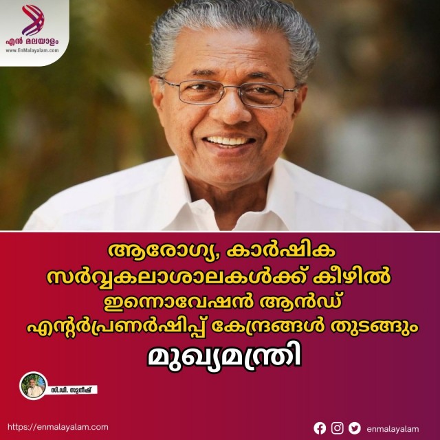 ആരോഗ്യ, കാർഷിക സർകലാശാലകൾക്ക് കീഴിൽ ഇന്നൊവേഷൻ ആന്റ് എന്റർപ്രണർഷിപ്പ് കേന്ദ്രങ്ങൾ തുടങ്ങും: മുഖ്യമന്ത്രി