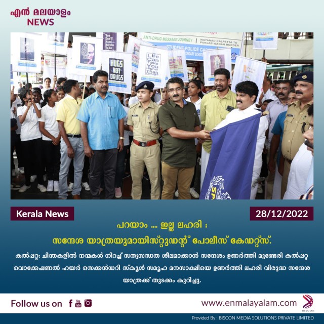 കൽപ്പറ്റ: ചിന്തകളിൽ നന്മകൾ നിറച്ച് സത്യസന്ധത ശീലമാക്കാൻ സന്ദേശം ഉണർത്തി മുണ്ടേരി കൽപ്പറ്റ വൊക്കേഷണൽ ഹയർ സെക്കൻഡറി സ്കൂൾ സമൂഹ മനസാക്ഷിയെ ഉണർത്തി ലഹരി വിരുദ്ധ സന്ദേശ യാത്രക്ക് തുടക്കം കുറിച്ചു. കൽപറ്റ എം എൽ എ അഡ്വ. ടി. സിദ്ധീഖ് സന്ദേശ യാത്ര ലീഡർ സ്റ്റുഡന്റ് പോലീസ് കേഡറ്റ് കമ്യൂണിറ്റി പോലീസ് ഓഫീസർ സജി ആന്റോയ്ക്ക് പതാക കൈമാറി ഉദ്ഘാടനം നിർവ്വഹിച്ചു. കൽപ്പറ്റ നഗരസഭ ചെയർമാൻ മുജീബ് കേയം തൊടി അദ്ധ്യക്ഷത വഹിച്ചു. കൽപ്പറ്റ സബ് ഡിവിഷൻ എ.എസ് പി ബസുമത്രി ഐ. പി. എസ് സന്ദേശ പ്രചരണ ലഘുലേഖ പ്രകാശനം ചെയ്തു. യാത്ര കടന്നു വിവിധ സ്ഥലങ്ങളിൽ പതിപ്പിക്കാനുള്ള ലഹരി വിരുദ്ധ സന്ദേശ സ്റ്റിക്കർ ജില്ലാ നാർക്കോട്ടിക്ക് സെൽ മേധാവിയും, സ്റ്റുഡന്റ് പോലീസ് നോഡൽ ഓഫീസറുമായ ബാലകൃഷ്ണൻ നിർവ്വഹിച്ചു. യാത്രയോട് ഐ ക്യദാർഡ്യം പ്രഖ്യാപിച്ചു നടൻ അബു സലിം കയ്യാപ്പ് പതിപ്പിച്ചു. യാത്രയുടെ ഓർമ്മപ്പെടുത്തലായി വിശിഷ്ട അതിഥികൾക്കും 41 കേഡറ്റുകളുടെ രക്ഷിതാക്കൾക്കും ലഹരി വിരുദ്ധ സന്ദേശം ഉൾക്കൊള്ളുന്ന ക്യാരി ബാഗ് വിതരണം സ്റ്റുഡന്റ് പോലീസ് കേഡറ്റ് നടത്തി. എസ് എസ് കെ ജില്ലാ പ്രൊജക്ട് ഓഫീസർ അനിൽ കുമാർ, വാർഡ് കൗൺസിലർ ഷിബു എം. കെ (പ്രിൻസിപ്പാൾ സജീവൻ പി. ടി, ഹെഡ് മാസ്റ്റർ പവിത്രൻ എം, ഗാർഡിയൻ ബോഡി പ്രസിഡണ്ട് മുസ്തഫ സി, പി. ടി. എ എക്സിക്യുട്ടീവ് അംഗം സലാം പി, ഡ്രിൽ പരിശീലകൻ ശ്രീധരൻ എന്നിവർ ആശംസകൾ നേർന്നു സംസാരിച്ചു. 52 അംഗ യാത്രാ സംഘത്തിൽ 41 കേഡറ്റുകളും 11 എസ്കോർട്ടിംഗ് സ്റ്റാഫും ഉൾപ്പെടുന്നു. യാത്രയുടെ ഭാഗമായി വിവിധ ഇടങ്ങളിൽ ബോധവത്ക്കരണ പരിപാടികൾ, ഫ്ളാഷ് മോബ്, സ്കിറ്റുകൾ എന്നിവ അവതരിപ്പിച്ചും ലഘുലേഖകൾ വിതരണം ചെയ്തും സ്റ്റിക്കറുകൾ പതിപ്പിച്ചും വയനാട് മുതൽ വാഗാ അതിർത്തി വരെ യാത്ര മുന്നോട്ടു പോകും. ഡിസംബർ 26-ന് ആരംഭിച്ച യാത്ര ജനുവരി 3 ന് അവസാനിക്കും.