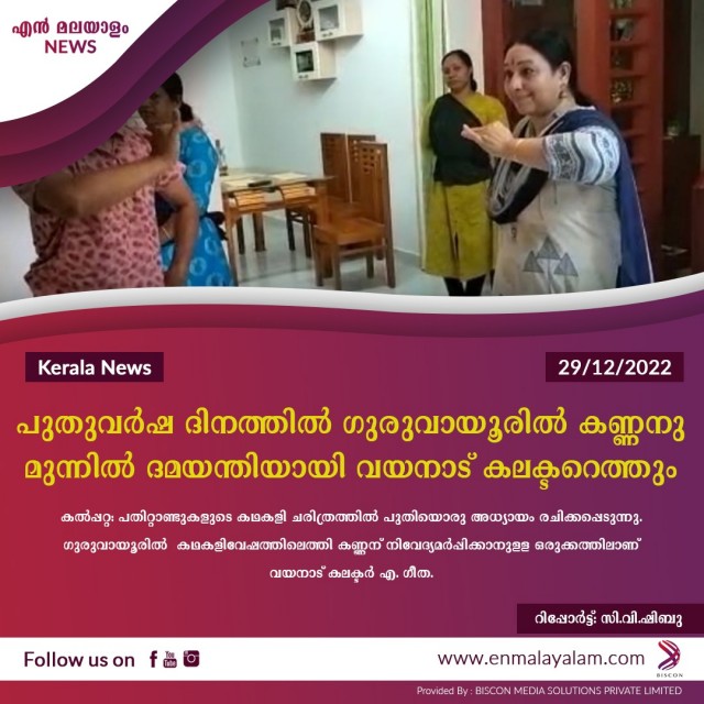 പുതുവർഷ ദിനത്തിൽ ഗുരുവായൂരിൽ കണ്ണനു മുന്നിൽ ദമയന്തിയായി വയനാട് കലക്ടറെത്തും.