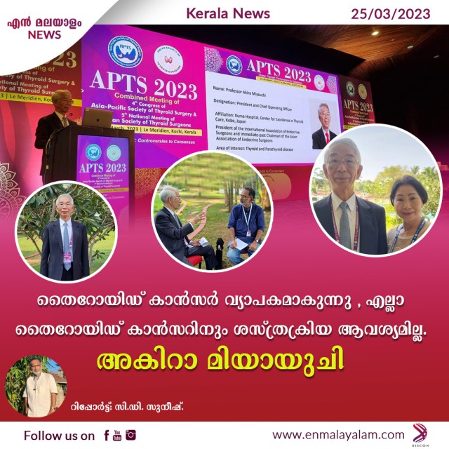 കൊച്ചി: ലോക വ്യാപകമായി തൈറോയിഡ് കാൻസർ വ്യാപരിക്കുന്ന പ്രവണത കണ്ടു വരുന്നുണ്ടെങ്കിലും എല്ലാ തൈറോയിഡ് കാൻസറിനും ശസ്ത്രക്രിയ ആവശ്യമില്ലെന്ന് ഇൻ്റർ നാഷണൽ അസോസിയേഷൻ ഓഫ് എൻഡോക്രൈൻ അസോസിയേഷൻ സർജൻസ് പ്രസിഡൻ്റും , ജപ്പാനിലെ സെൻ്റർ ഫോർ എക്സലൻസ് ഇൻ തൈറോയ്ഡ് കെയർ കുമ ഹോസ്പിറ്റലിലെ കൂ ആയ അകിറാ മിയായുചി പറഞ്ഞു. കൊച്ചിയിൽ നടക്കുന്ന APTS 2023 ൽ പങ്കെടുക്കാനെത്തിയ കാൻസർ രോഗ വിദഗ്ദൻ അകിറാ ,, എൻ .മലയാളത്തിന് അനുവദിച്ച പ്രത്യേക അഭിമുഖത്തിലാണ് തൈറോയിഡ് കാൻസറിനെ കുറിച്ച് ഈ ശ്രദ്ധേയ നിരീക്ഷണം നടത്തിയത്. ലോകത്തിൽ ഭൂരിഭാഗം പേരും തൈറോയിഡ് കാൻസറുമായി ജീവിക്കുകയാണ്. അധികമാളുകളിലും ലക്ഷണങ്ങൾ ഒന്നും കാണിക്കില്ല. കൊറിയയിൽ നടത്തിയ ജനകീയ തൈറോയിഡ് സ്കാനിങ്ങിൽ 18 ശതമാനം പേർക്കും തൈറോയിഡ് കാൻസറുമായാണ് ജീവിക്കുന്നതെന്ന് തെളിഞ്ഞു. Latent കാൻസർ അപകടകാരിയാണെന്നും അകിറ അടിവരയിട്ടു.