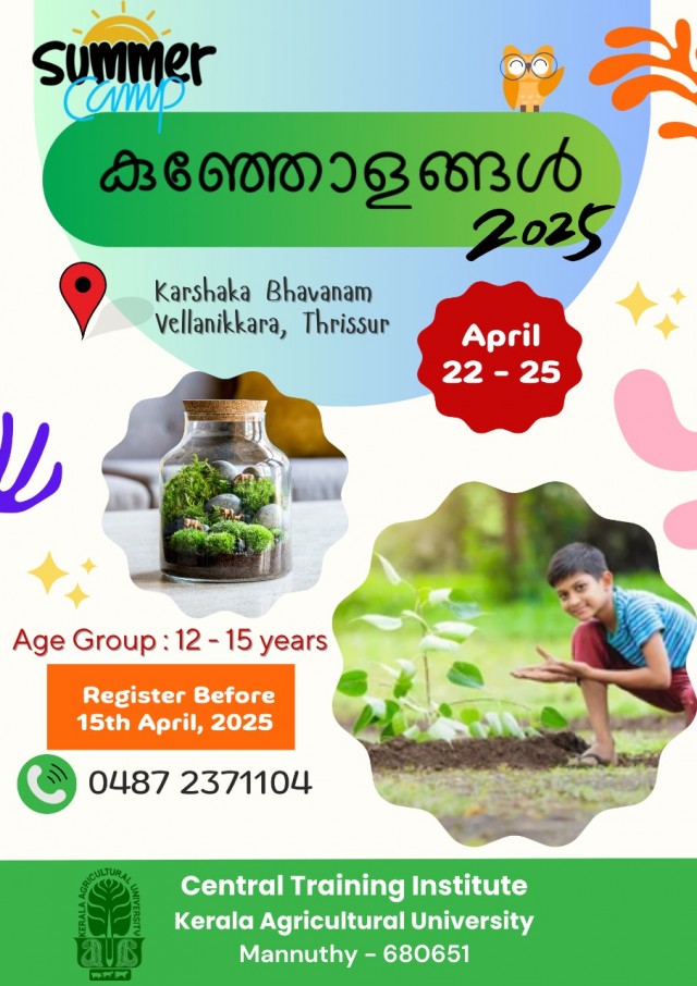 കേരള കാർഷിക സർവ്വകലാശാല സെൻട്രൽ ട്രെയിനിംഗ് ഇൻസ്റ്റിറ്റ്യൂട്ടിൻ്റെ നേതൃത്വത്തിൽ 4 ദിവസത്തെ അവധിക്കാല കൃഷി പഠന ക്യാമ്പ് സംഘടിപ്പിക്കുന്നു.