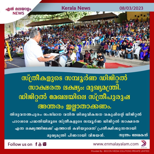 സ്ത്രീകളുടെ സമ്പൂര്ണ ഡിജിറ്റല് സാക്ഷരത ലക്ഷ്യം: മുഖ്യമന്ത്രി. ഡിജിറ്റല് മേഖലയിലെ സ്ത്രീ-പുരുഷ അന്തരം ഇല്ലാതാക്കണം.