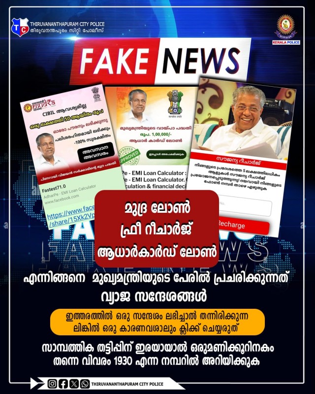 മുദ്ര ലോൺ, ഫ്രീ റീചാർജ്, ആധാർ കാർഡ് ലോൺ എന്നിങ്ങനെ മുഖ്യമന്ത്രിയുടെ പേരിൽ പ്രചരിക്കുന്നത് വ്യാജ സന്ദേശങ്ങൾ..