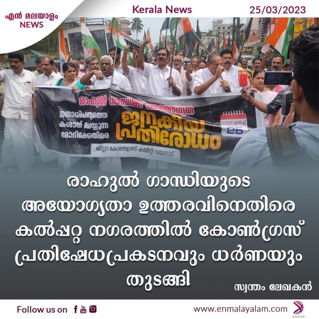 രാഹുൽ ഗാന്ധിയുടെ അയോഗ്യതാ ഉത്തരവിനെതിരെ കൽപ്പറ്റ നഗരത്തിൽ കോണ്ഗ്രസ് പ്രതിഷേധപ്രകടനവും ധര്ണയും തുടങ്ങി