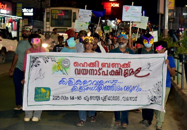 കല്പറ്റ: വയനാട് പക്ഷിമേളയുടെ മുന്നോടിയായി കല്പറ്റ പുതിയ സ്റ്റാൻഡ് മുതൽ ജൈത്ര തീയ്റ്റർ വരെ വിളംബര ജാഥ സംഘടിപ്പിച്ചു. മുളന്തുരുത്തി ആല കൾച്ചറ ൽ സെന്ററിലെ മനു ജോസിന്റെ നേതൃത്വത്തിൽ തയ്യാറാക്കിയിട്ടുള്ള പക്ഷിപ്പ്പാവകളുമായാണ് ജാഥ മുന്നോട്ടുപോയത്.